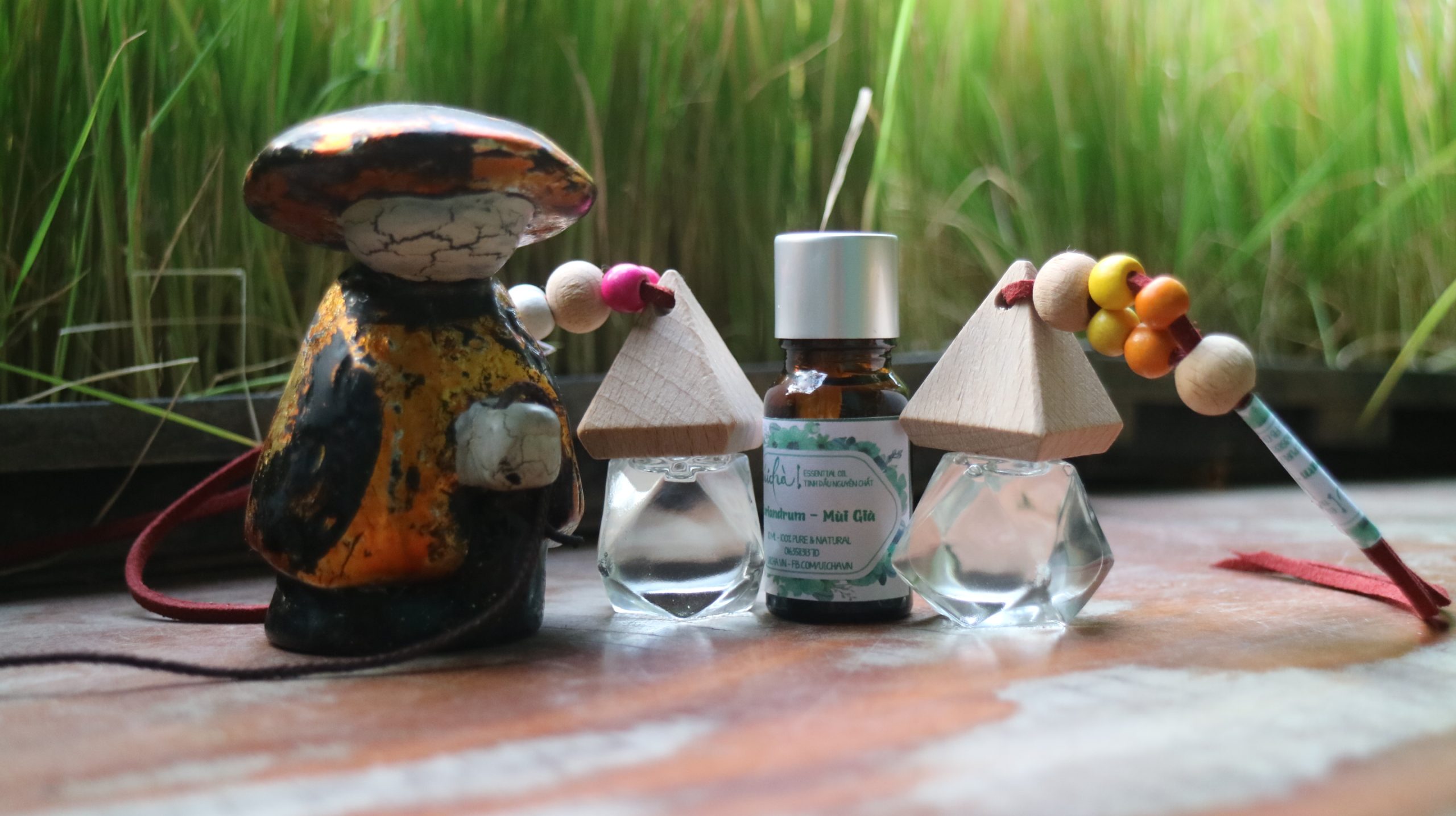 Tinh dầu Mùi già Úi Chà có các loại: lọ nhỏ giọt 5ml: 300k, 10ml: 600k, lọ treo long lanh như hình: 540k.